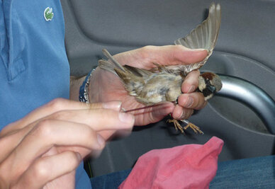 Chaque oiseau piégé par le filet est examiné sous toutes les coutures, pesé, mesuré (avec un pied à coulisse) et bagué. Deux prises de sang sont effectuées à quelques minutes d’intervalle, le taux d’hormones dans le sang permettant d’évaluer le niveau de stress. Le moineau est ensuite relâché.