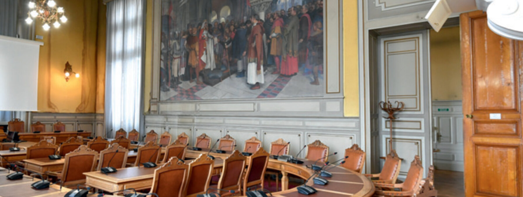 D’importants travaux vont être menés à partir de septembre 2022 dans la salle du conseil et la petite salle attenante. Le parquet, les boiseries, mais aussi le mobilier et les pièces de dinanderie (serrurerie, lustres, horloge, etc.), sans oublier la toile monumentale de Charles-Dominique Fouqueray, seront remis en état dans le respect de leur intérêt patrimonial. Les tentures, le grand tapis, la moquette qui recouvre l’estrade, les rideaux seront remplacés. Des aménagements liés à la sécurité et l’accessibilité, ainsi que la mise aux normes d’équipements techniques seront également réalisés.